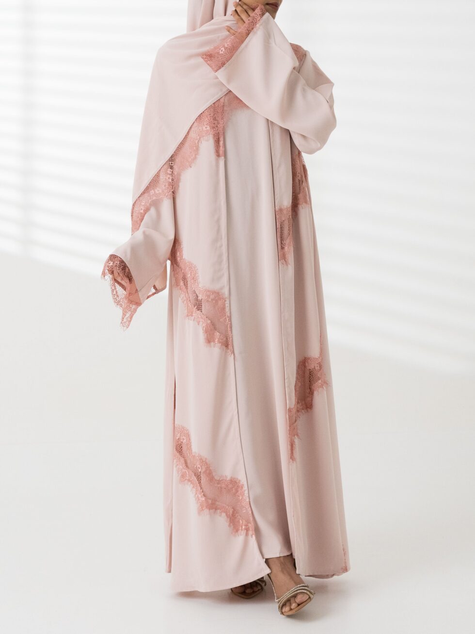 Exquisite lace design on the abaya and hijab for a refined touch.